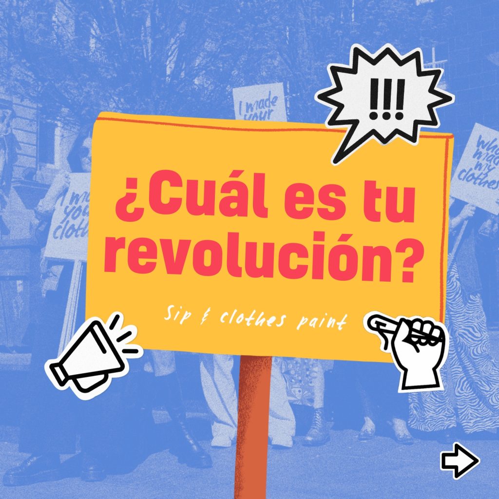 Sip&Paint ¿Cuál es tu revolución? Exprésate a través de la pintura en una prenda de vestir y además, de forma guiada, en un espacio de inspiración. Además, estaremos contribuyendo al medio ambiente con el uso responsable de las vestimentas. Par inscribirte, ingresa al enlace de Fashion Revolution