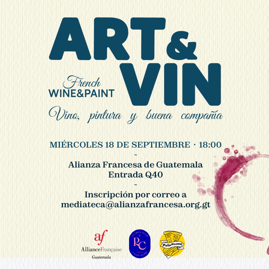 Art&Vin, une nuit de plaisir Disfruta de una noche llena de colores, vino y buena compañía en nuestro #tallerdepintura (wine&paint). Reserva tus entradas al correo [email protected] (Cupos limitados) Miércoles 18 de septiembre | 18:00 horas Entrada Q40 Jardín de la Alianza Francesa de Guatemala Parqueo gratuito (según disponibilidad) Junto a @RivieraClub_ Patio Pizzeria
