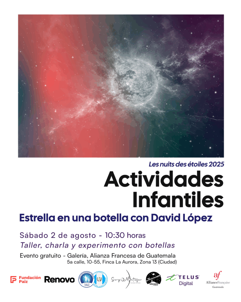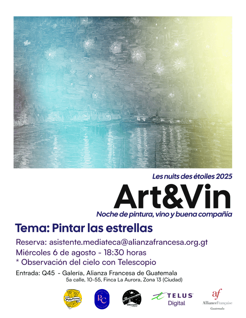 Noche de vino francés y buena compañía Participa y disfruta de una noche estrellada en nuestro evento Art&Vin con la temática “Pintar las Estrellas”, en el marco de #LesNuitsDesEtoiles para compartir con tus amigos. Reserva: [email protected] Entrada: Q45 Miércoles 6 de agosto | 18:30 horas Jardín, Alianza Francesa, 5ta calle 10-55, z13 Parqueo gratuito según […]